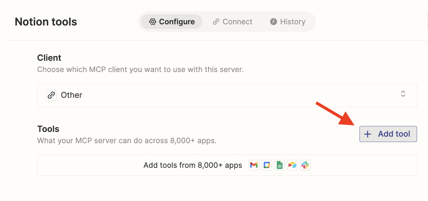 A pop-up will appear: In the MCP Client field, select Other. Give your server a memorable name and click Add tool.