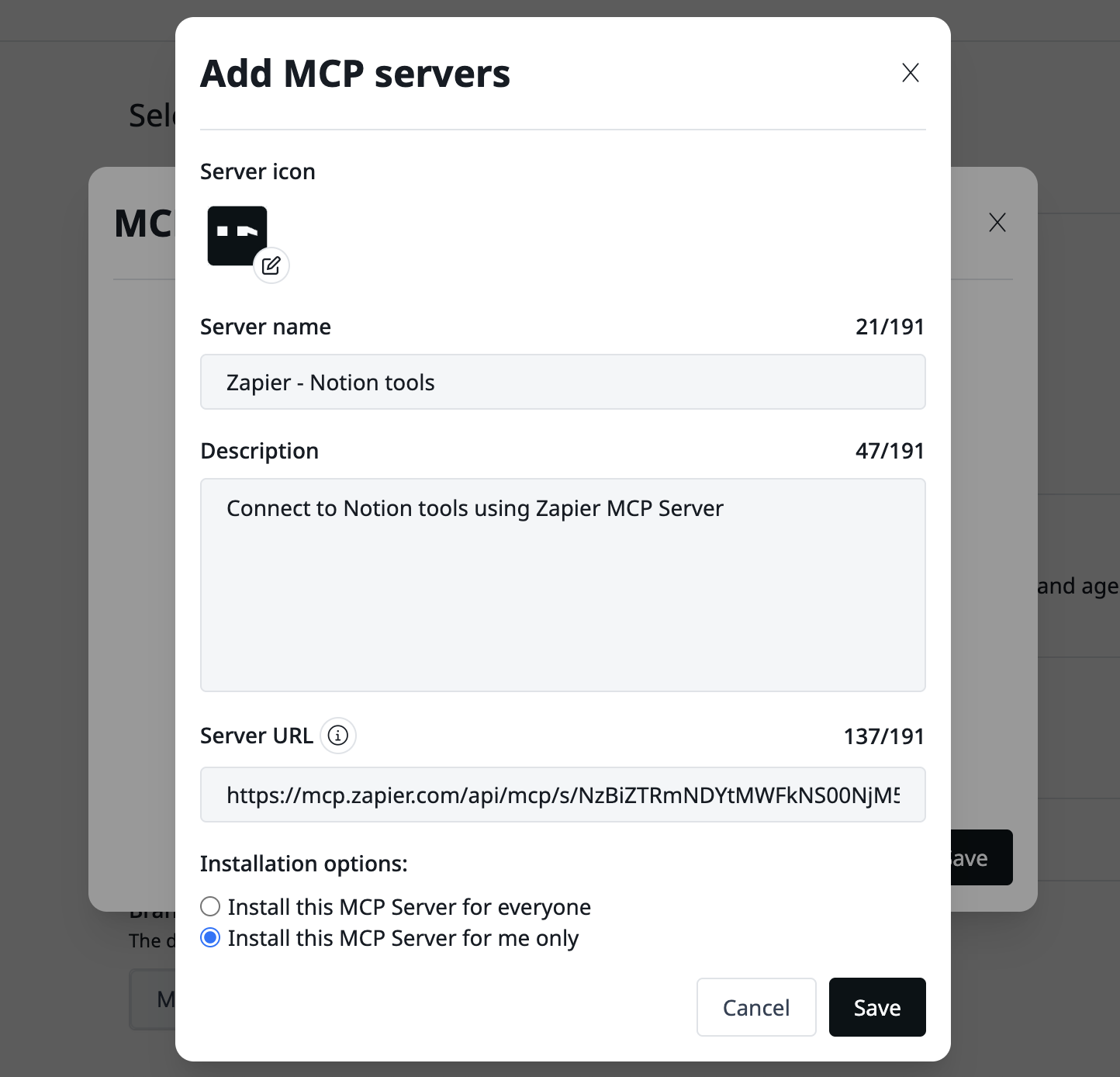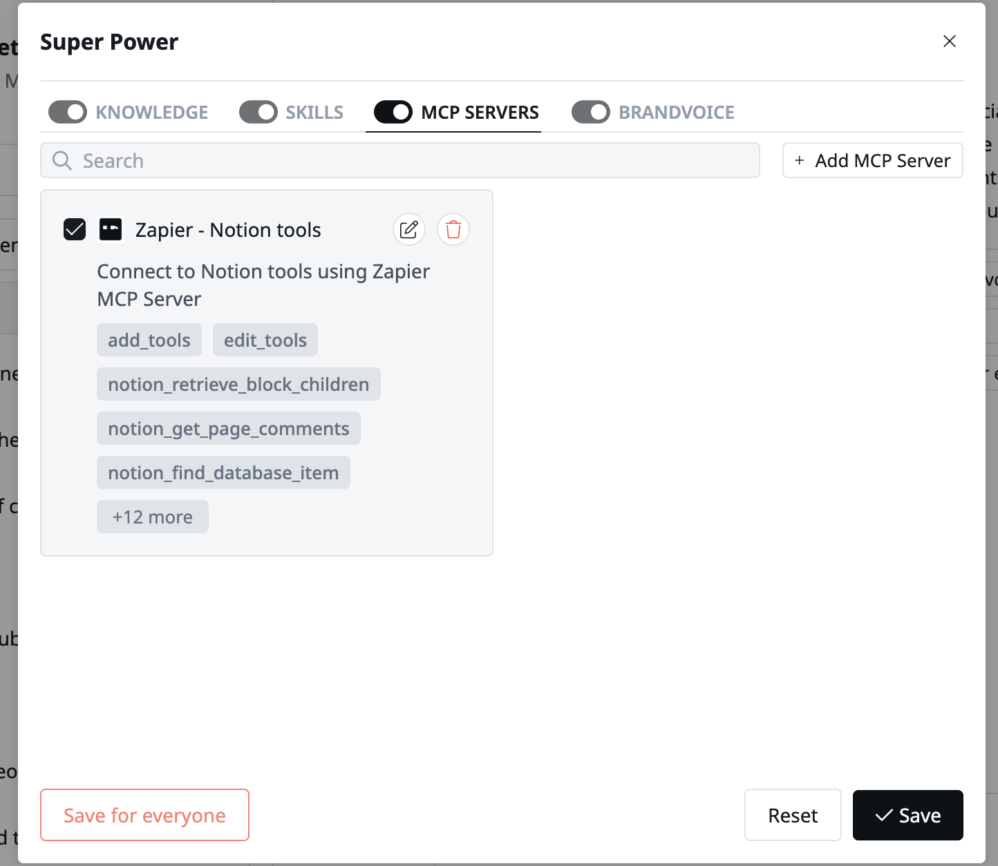 You’re almost there! With your Zapier MCP server set up and the server URL copied, just return to TeamPal and follow the steps to add this MCP server to your Agent’s Super Power settings.