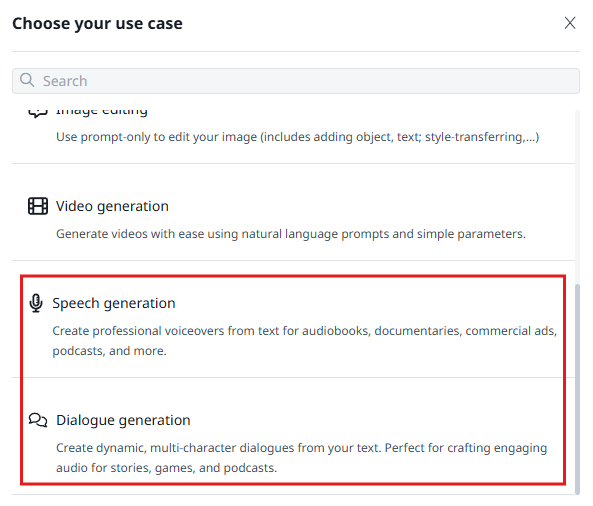 - Choose Your Use Case: Select between "Speech Generation" or "Dialogue Generation."