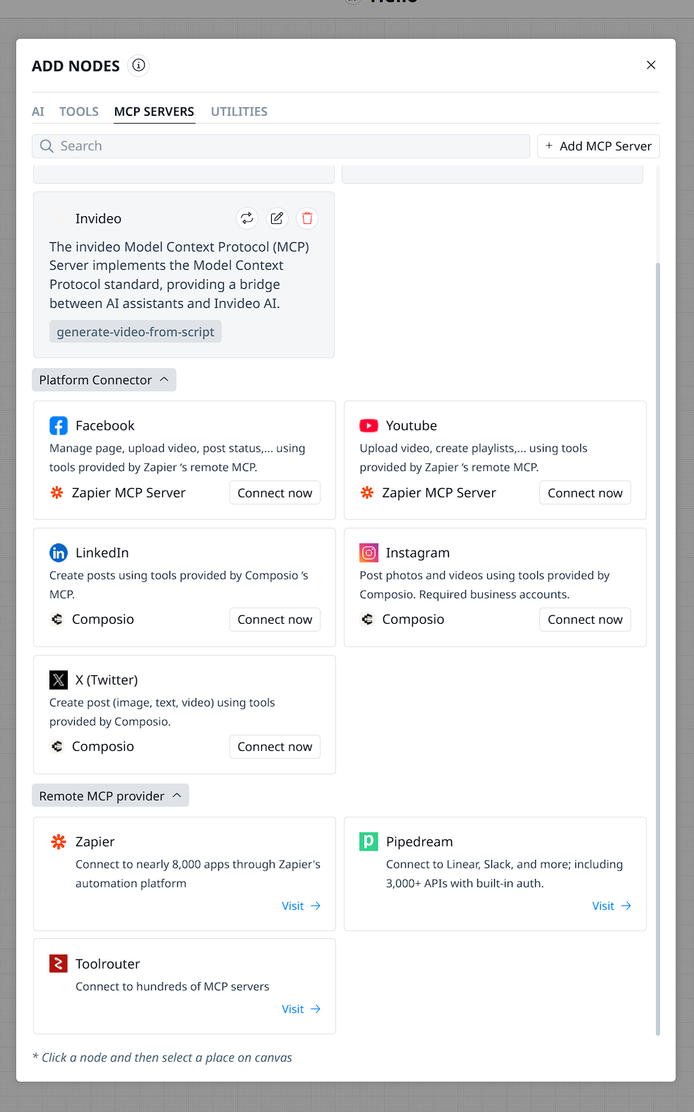 - Choose Your Platform: Select the social platform node you want to use (e.g., YouTube) from the "Add Nodes" menu.