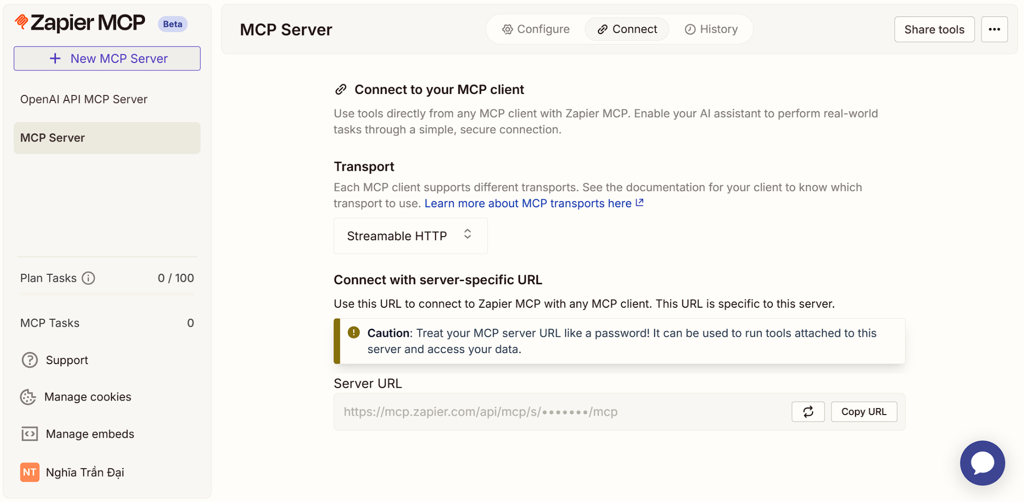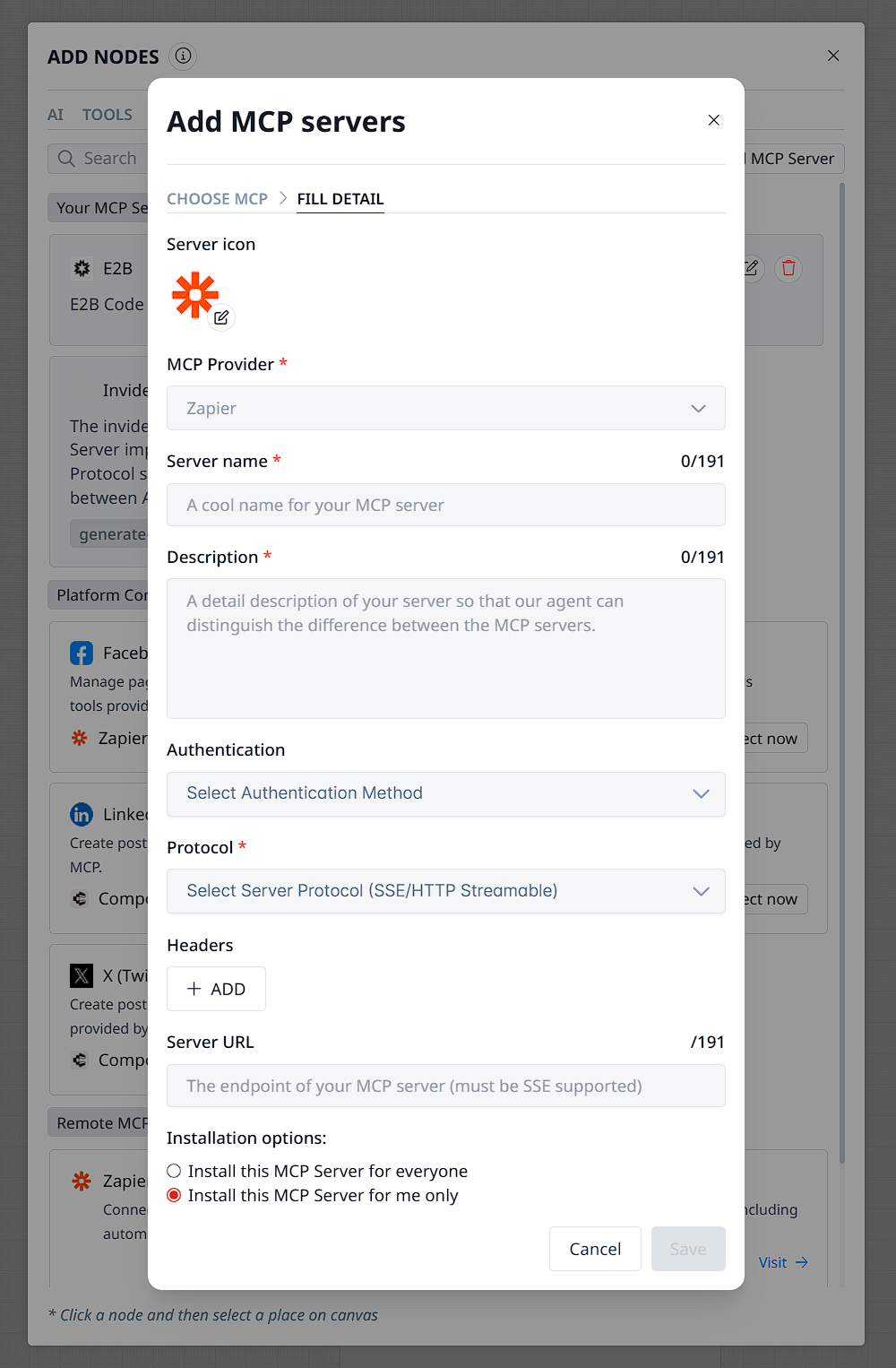 - Connect to an MCP Provider: Visit your preferred provider (e.g.,mcp.zapier.com). Create an MCP server, integrate the tools you need, and complete a one-time sign-in to authenticate your social media account.